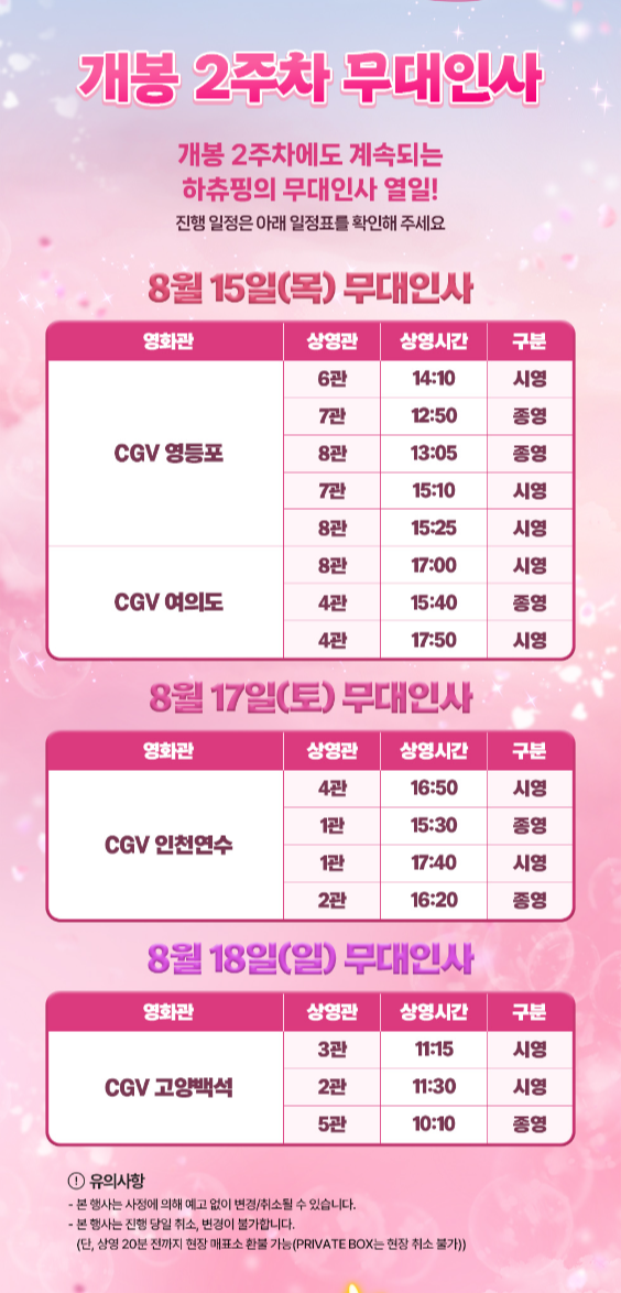 개봉 2주차 무대인사 8/15(목) 영등포, 여의도, 8/17(토) 인천연수, 8/18(일) 고양백석